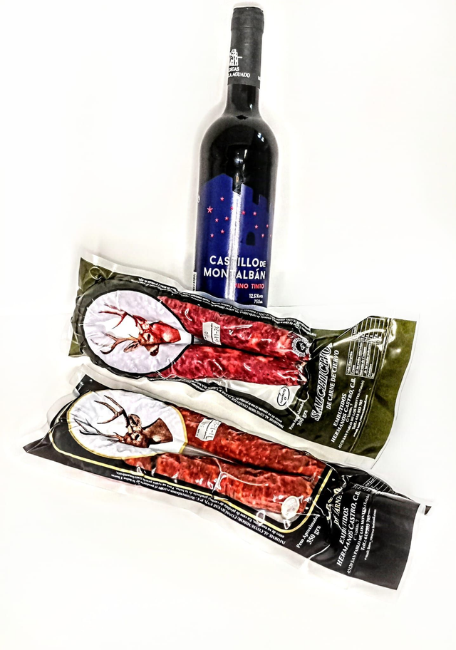 ESTA CESTA CONTIENE: + 1 BOTELLA DE VINO TINTO MANCHEGO +1 CHORIZO DE CIERVO +1 SALCHICHON DE CIERVO +1 ROSA ROJA HECHA A MANO PAPEL +1 CESTA FIELTRO COLOR NEGRO