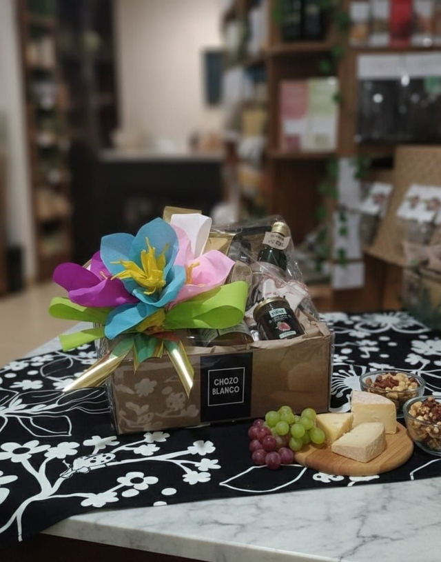 Presentada con una decoración artesanal de flores de papel y elegantes acabados dorados, esta cesta invita a compartir desde un desayuno natural hasta una cena gourmet inolvidable. Calidad contrastada para los paladares más exigentes.